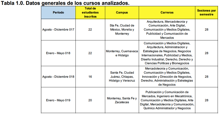 RESUMEN: El siguiente artículo muestra los resultados del estudio aplicado al alumnado de diversos campus del Tecnológico de Monterrey que cursaron la materia Fotografía e Imagen Digital en modalidad FIT durante los semestres otoño 017 a primavera 019. El objetivo de este proyecto es conocer los niveles de aceptación o rechazo que se tienen de esta asignatura que tiene características muy peculiares. La metodología fue mixta, la parte cuantitativa fue con un instrumento en el que se midió la satisfacción hacia el curso y el profesor por parte del estudiantado. En materia cualitativa, se realizaron entrevistas profundas al estudiantado, y se les solicitó un escrito en el que plasmaron sus ideas sobre el curso. Como resultado, el índice de aceptación hacia este curso ha incrementado con el paso del tiempo, y el uso de las Tecnologías de Información y Comunicación (TICs), influye para que el estudiantado acepte esta clase de modalidades.